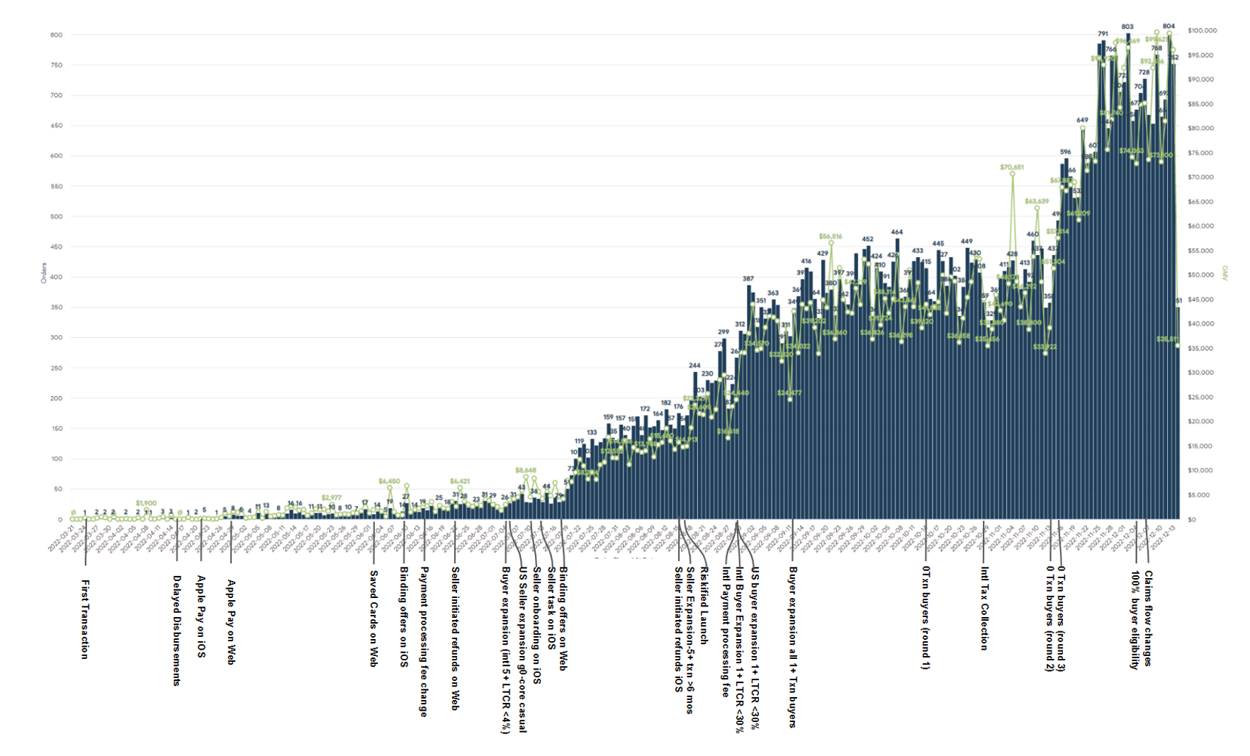 Grailed had the desire to reach industry standards and differentiate our product from competitors via the Grailed Payments program. On the surface, this program aimed to provide multiple payment options to our users for the first time in 9 years and a better user experience for all, but for the business, it also increased our revenue and mitigated risk, fraud, customer experience complaints, and more. We previously had only offered PayPal, which led to sellers losing claims and getting blocked, high fees for the business, the inability to offer our own shipping labels, and more severe problems. The Payments Squad was formed to handle integrating more payment options such as credit cards, Apple Pay, and Klarna, and updating any payments-related factors such as: international taxes, internal tools for customer experience, FAQ pages, card management system, updating binding offer and refund flows, monitoring risks, and data analytics. In our first year, we saw our user preference for Grailed Payment options grow to 75%, and chargeback rates reduce by 3.05%.